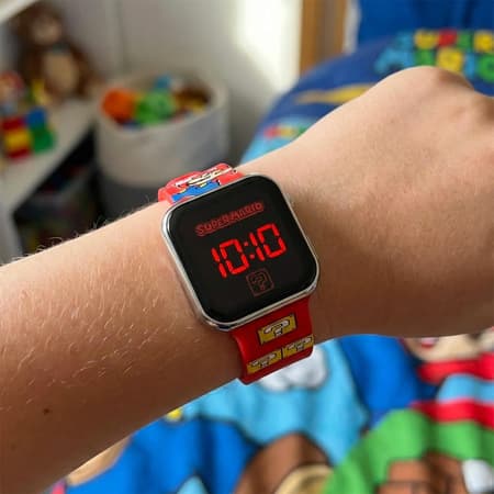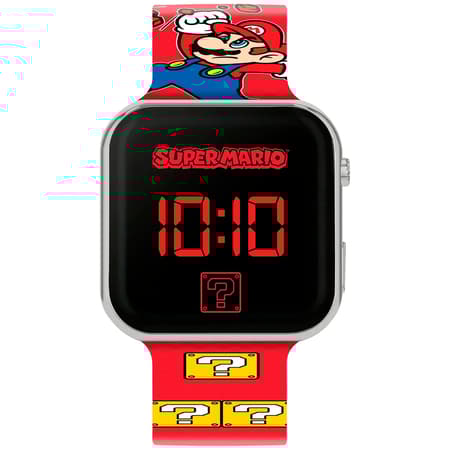 Cette petite montre numérique pratique comprend un cadran au design Super Mario, un boîtier en plastique, un affichage numérique rouge et un bracelet rouge imprimé Mario amusant avec une boucle traditionnelle.