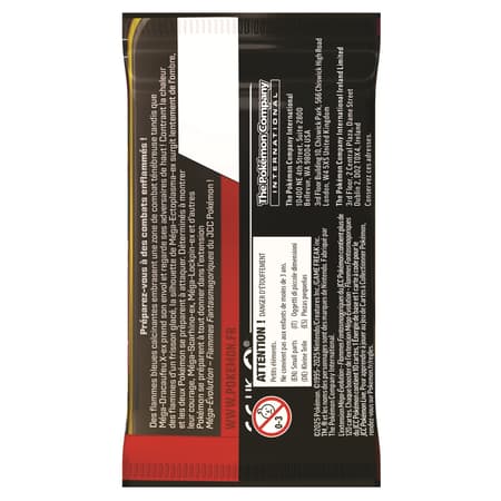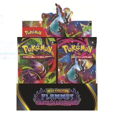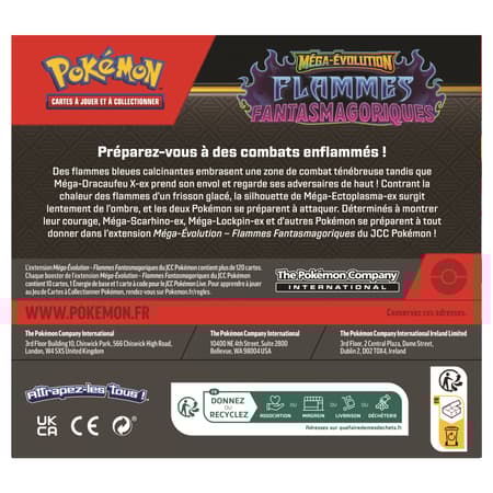 Des flammes bleues calcinantes embrasent une zone de combat ténébreuse tandis que Méga-Dracaufeu X-ex prend son envol et regarde ses adversaires de haut ! Contrant la chaleur des flammes d’un frisson glacé, la silhouette de Méga-Ectoplasma-ex surgit lentement de l’ombre, et les deux Pokémon se préparent à attaquer. Déterminés à montrer leur courage, Méga-Scarhino-ex, Méga-Lockpin-ex et d’autres Pokémon se préparent à tout donner dans l’extension Méga-Évolution - Flammes Fantasmagoriques du JCC Pokémon !